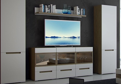 - Корпус мебели выполнен в цвете «швейцарский вяз», фасады — в цвете «белый матовый»;