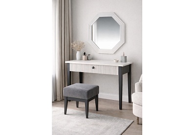 Строгость линий и геометрически правильные формы мебели поддержаны контраcтным цветовым решением: чистый белый цвет каркаса и фасадов в сочетании с чёрной матовой фурнитурой и тёмно-серыми рамками фасадов.